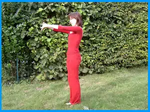 Puis, en expirant lentement, se pencher en avant, en basculant le bassin vers l’avant. Tout en se penchant en avant, tirer les bras vers l’arrière, loin du corps, en respectant les possibilités de ses articulations. Si possible, garder les jambes tendues; si nécessaire ou en cas de dos sensible, plier les genoux. Garder la position entre 5 et 10 secondes.